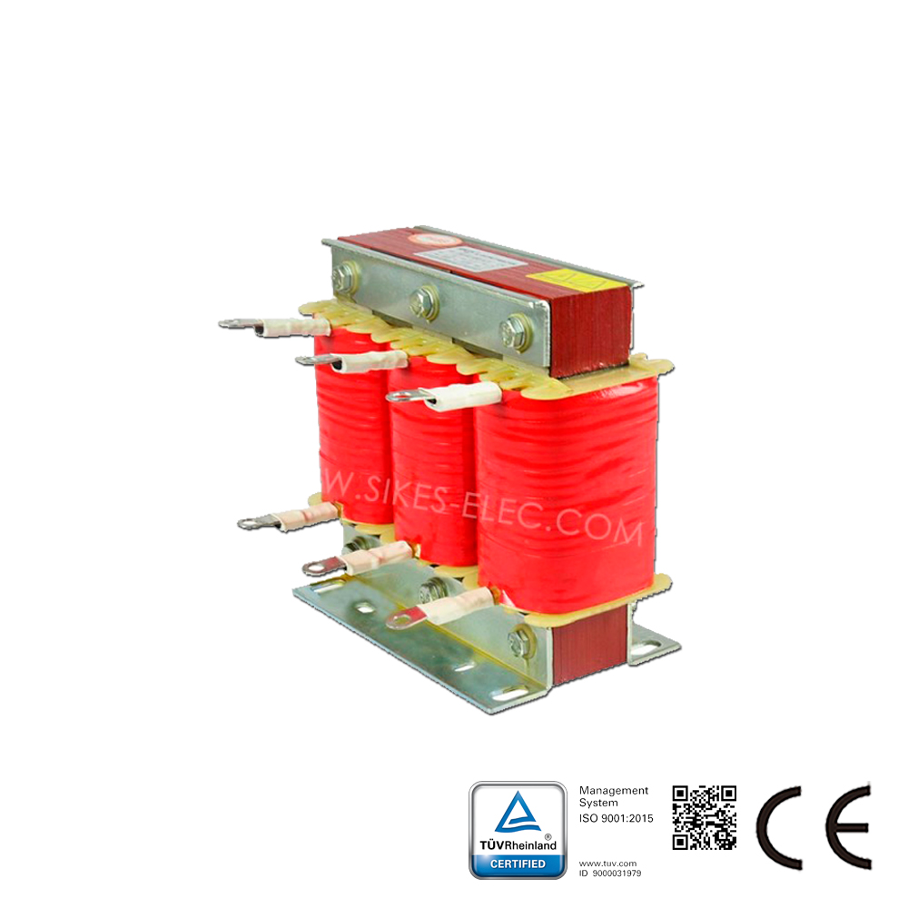 三相交流输出电抗器用于变频器的输出端起到平滑滤波、降低瞬变电压dv/dt、延长电机寿命、降低电机噪音及涡流损耗、降低输出高次谐波造成的漏电流、保护变频器内部功率开关器件等作用。