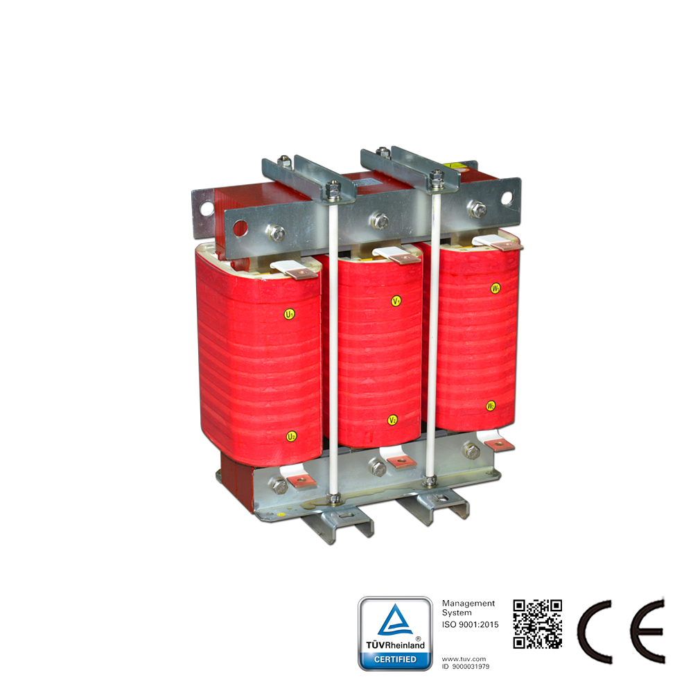 三相交流输出电抗器用于变频器的输出端起到平滑滤波、降低瞬变电压dv/dt、延长电机寿命、降低电机噪音及涡流损耗、降低输出高次谐波造成的漏电流、保护变频器内部功率开关器件等作用。