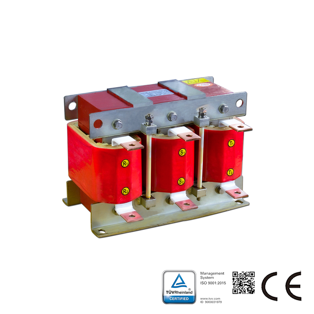 三相交流输出电抗器用于变频器的输出端起到平滑滤波、降低瞬变电压dv/dt、延长电机寿命、降低电机噪音及涡流损耗、降低输出高次谐波造成的漏电流、保护变频器内部功率开关器件等作用。